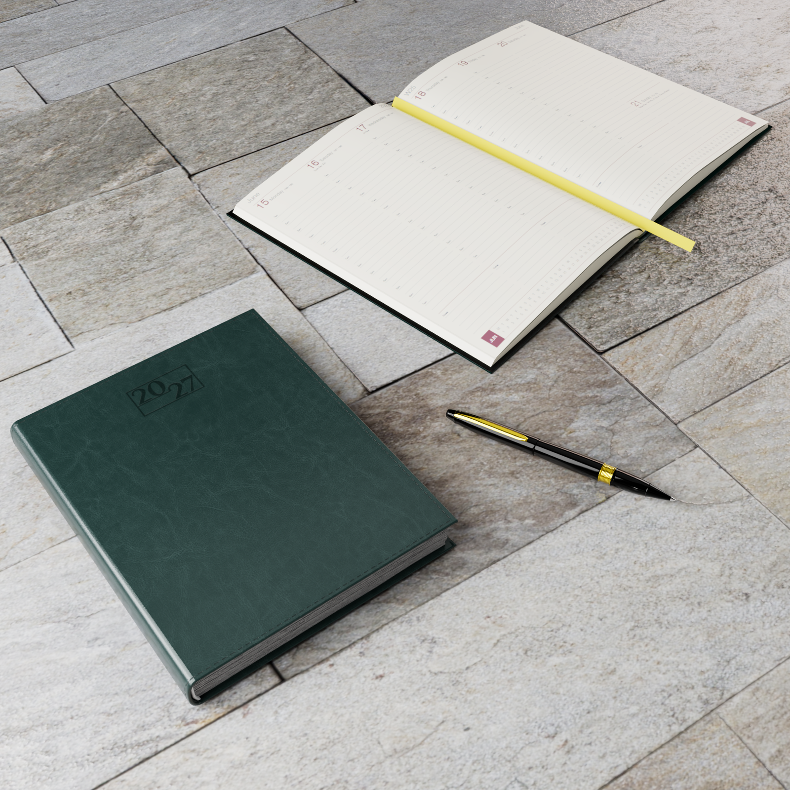 Inside, the diary features a week-to-view layout across two pages, allowing for an organized and clear overview of your schedule. The cream-colored paper gives the pages a warm, elegant feel, enhancing both readability and the writing experience. Finished with a real perimeter stitch and a sophisticated ribbon marker, the Harrogate Quarto Diary is the perfect blend of functionality and luxury. Ideal for professionals, corporate gifting, or personal use, this diary stands out with its refined craftsmanship and premium materials, making it an indispensable tool for the discerning planner.