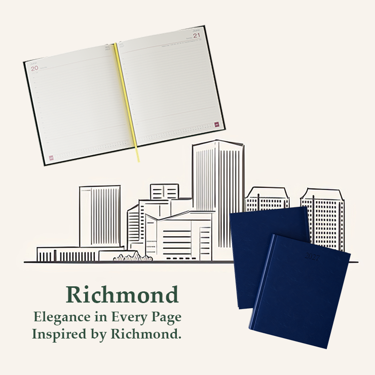 The Richmond Faux Leather Quarto Diary – Cream Paper – Day Per Page offers the perfect blend of luxury and practicality, designed for individuals who demand the finest in both form and function. Wrapped in our premium Richmond Faux Leather material, the diary exudes a rich, leather-like texture that is both sophisticated and durable. The Quarto size provides ample space for daily planning, while remaining compact enough for easy portability.