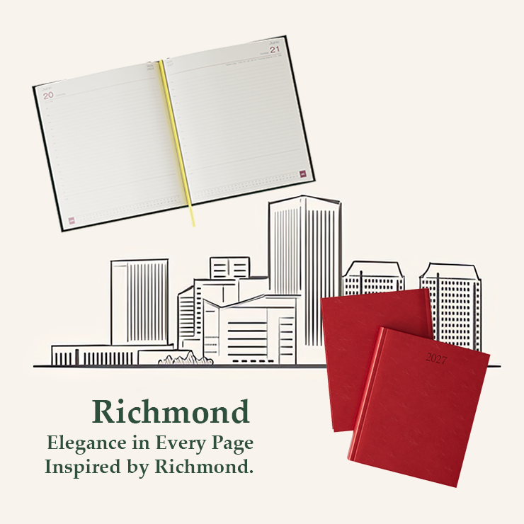 The Richmond Faux Leather Quarto Diary – Cream Paper – Day Per Page offers the perfect blend of luxury and practicality, designed for individuals who demand the finest in both form and function. Wrapped in our premium Richmond Faux Leather material, the diary exudes a rich, leather-like texture that is both sophisticated and durable. The Quarto size provides ample space for daily planning, while remaining compact enough for easy portability.